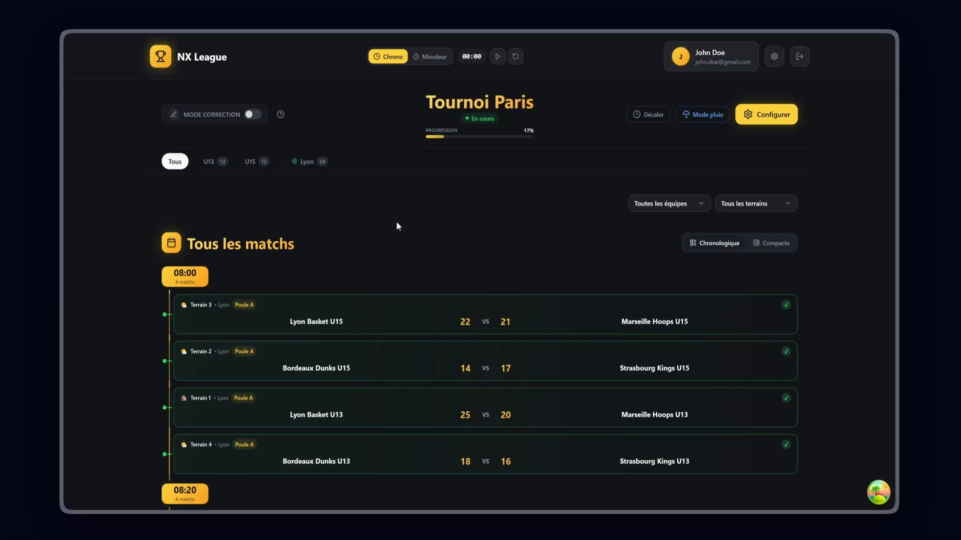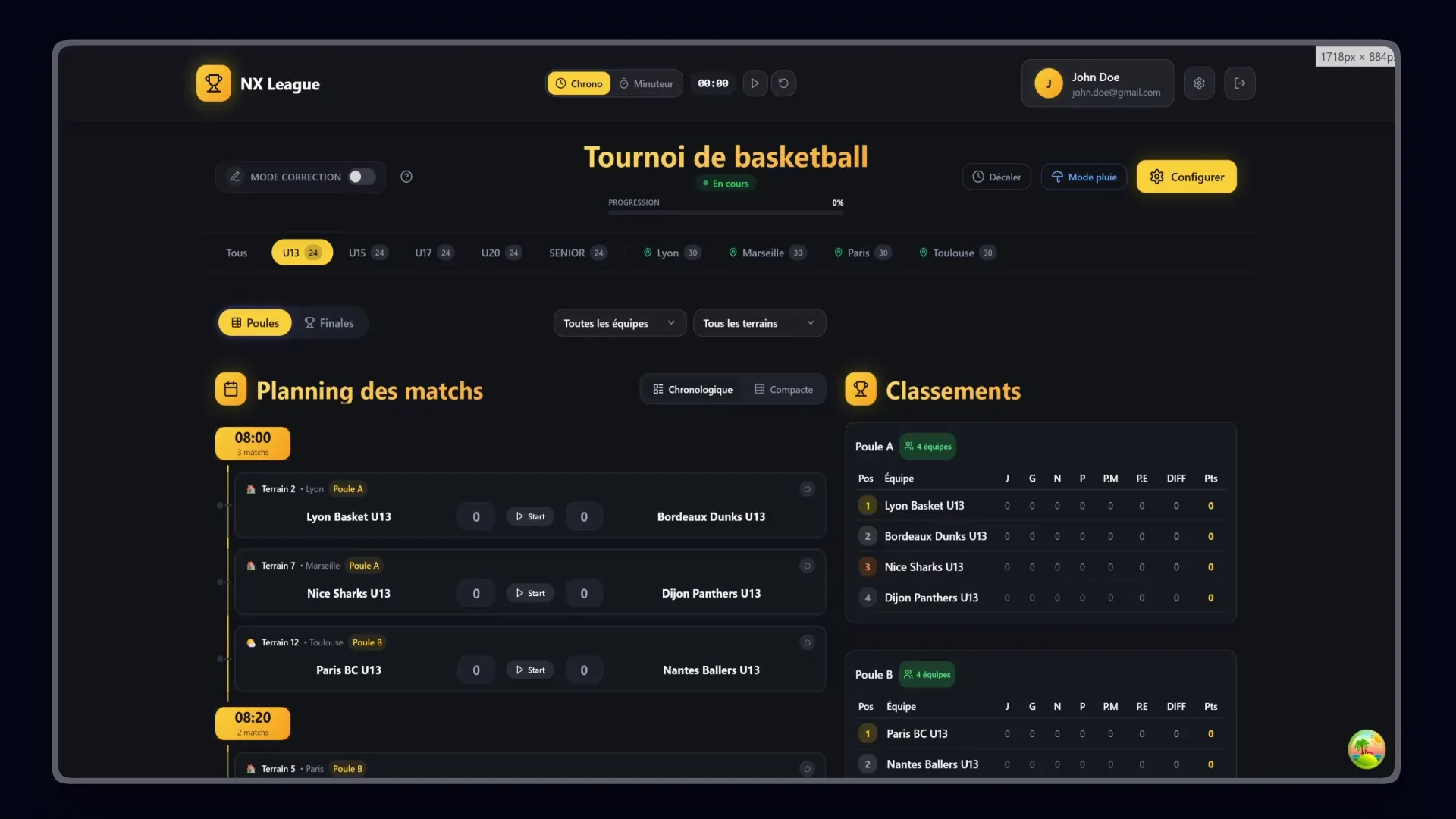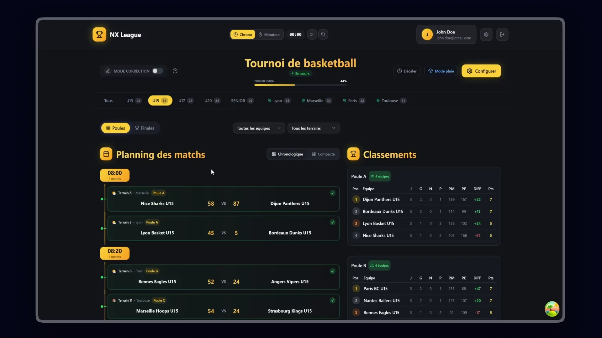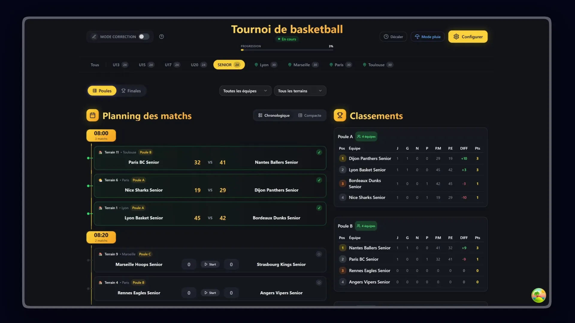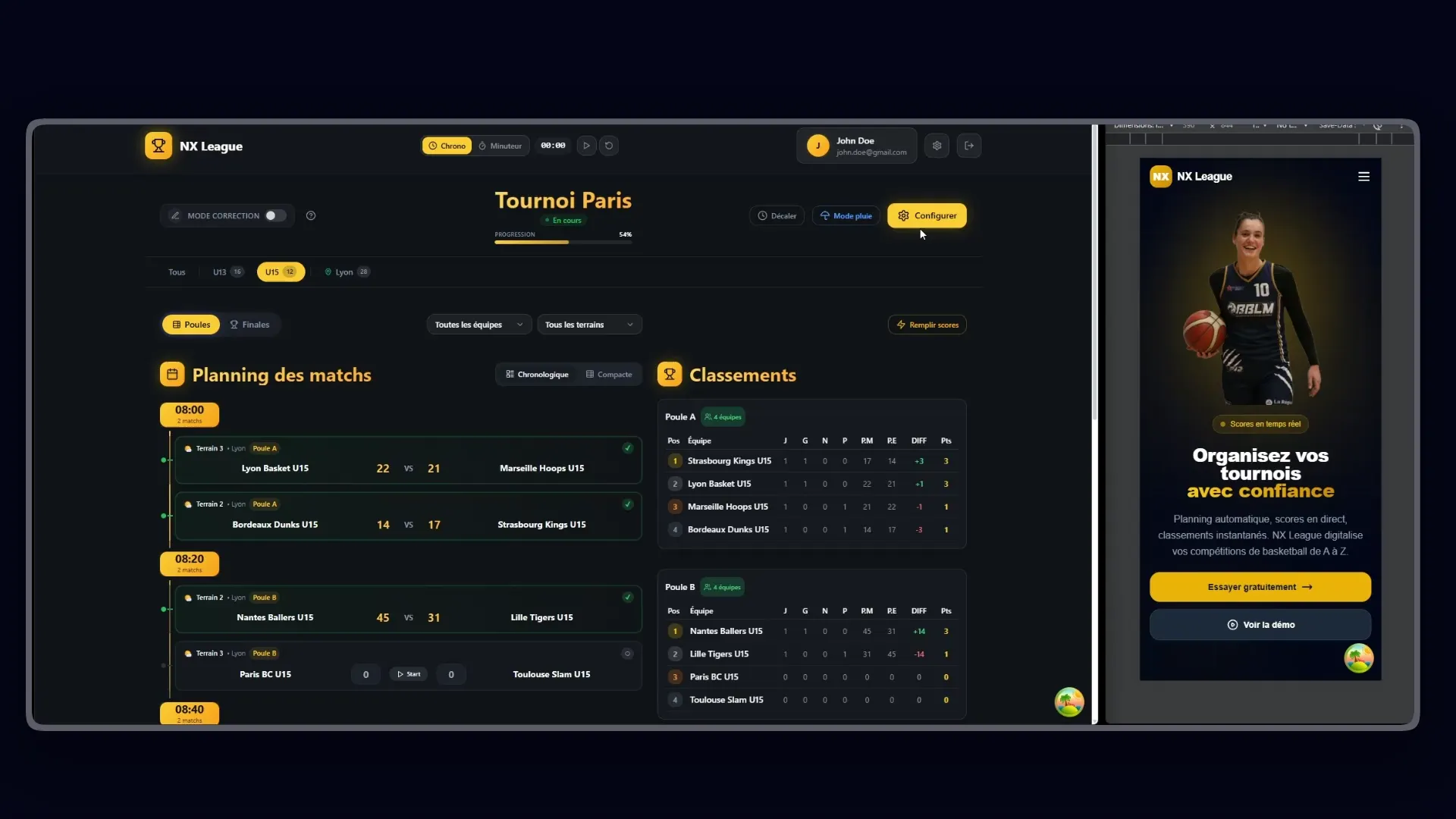 La veille du tournoi, vous dormez tranquille. Le planning est fait, les scores seront en direct, les classements se calculent tout seuls. Conçu en France, pensé pour le terrain.